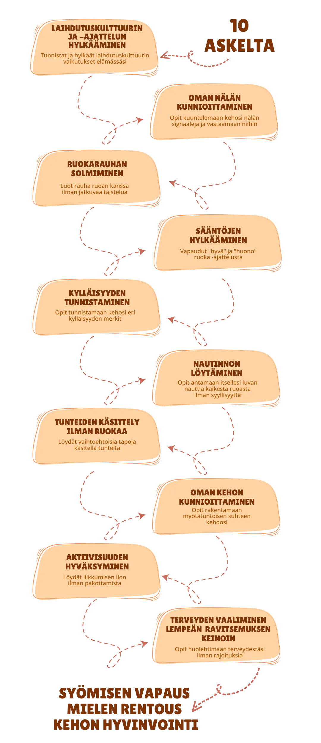 Intuitiivisen syömisen 10 askelta -valmennus opettaa sinut kuuntelemaan kehosi luonnollista viisautta ilman rajoituksia, laskemista tai syyllisyyttä. Se ei ole uusi dieetti – se on vapautuminen dieeteistä.
