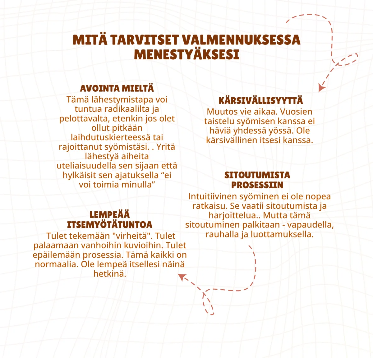 Jos olet laihduttanut, rajoittanut syömistä tai syönyt tiukkojen sääntöjen mukaan jo vuosia tai vuosikymmeniä, kehosi ja mielesi tarvitsevat aikaa oppia luottamaan uudelleen. Vanhat toimintamallit tulevat nousemaan aika ajoin pintaan. Pelot ja epäilykset tulevat vastaan. Tämä on normaalia. Intuitiivinen syöminen ei ole helppo tie - mutta jokainen askel vie kohti parempaa terveyttä, niin henkisesti kuin fyysisestikin.